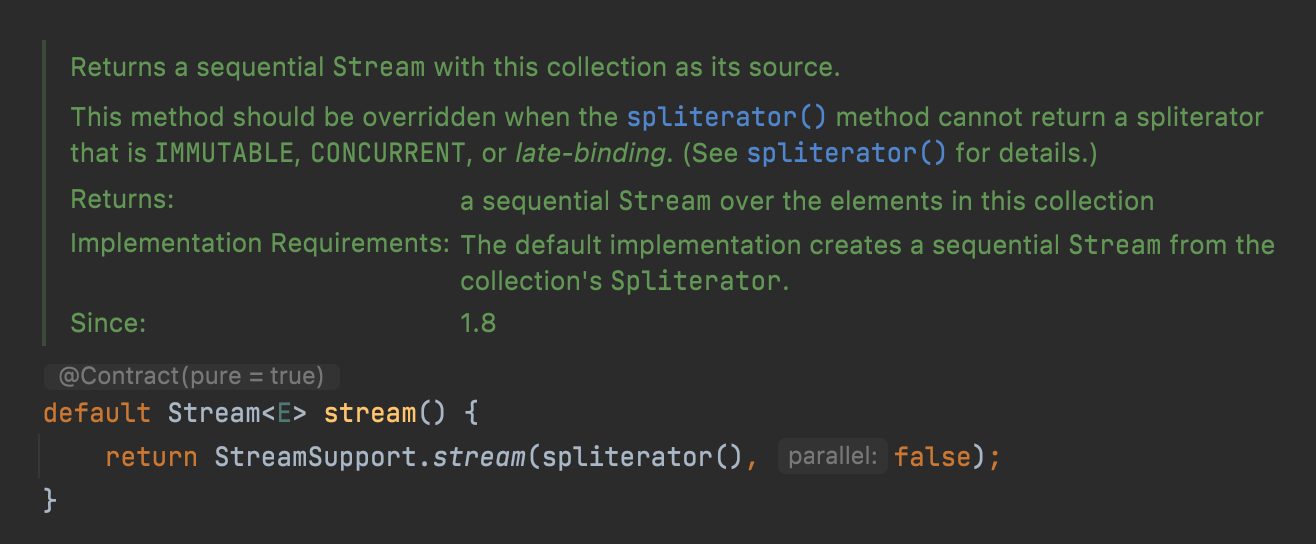 대표적으로 Collection 인터페이스의 removeIf()나 stream()이 default 메서드로 구현되어 있다.