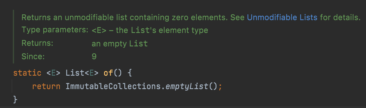 기본적으로 클래스의 정적 메서드와 같으며, 가장 대표인 static 메서드의 예로는 List.of를 들 수 있다.
