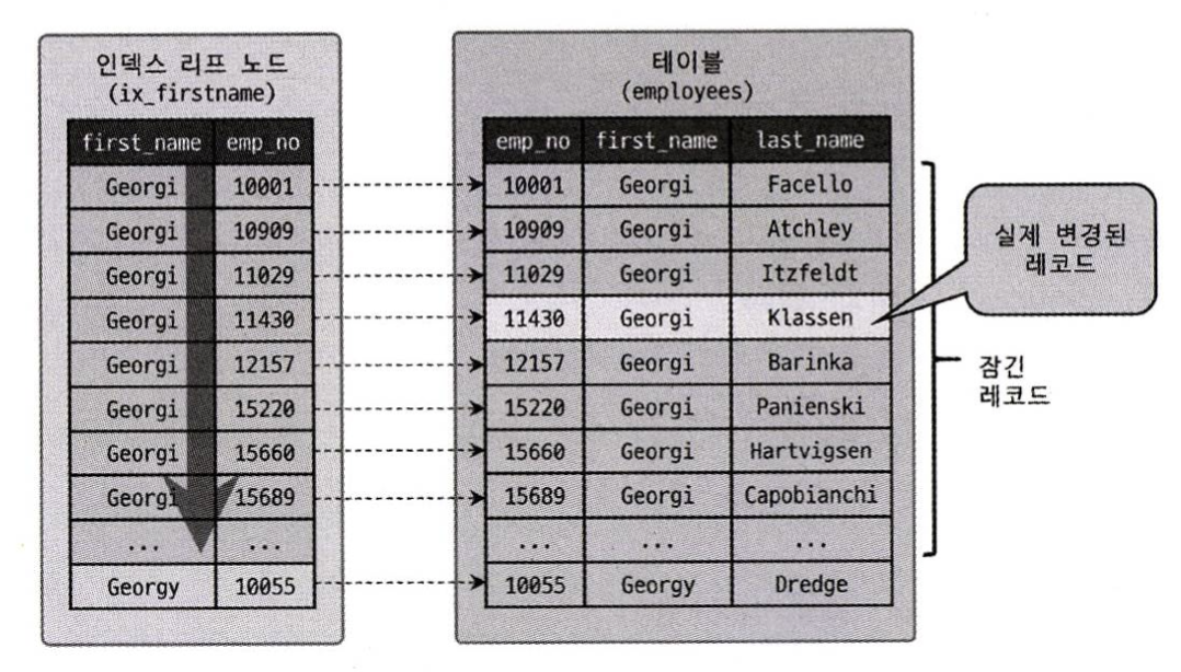 InnoDB의 잠금은 레코드를 잠그는 것이 아니라 인덱스를 잠그는 방식으로 처리된다. 즉, 변경할 레코드를 찾을 때 검색한 인덱스의 레코드를 모두 잠궈야 한다. 이와 같은 특징 때문에 MySQL에서는 인덱스 설계가 굉장히 중요하다.