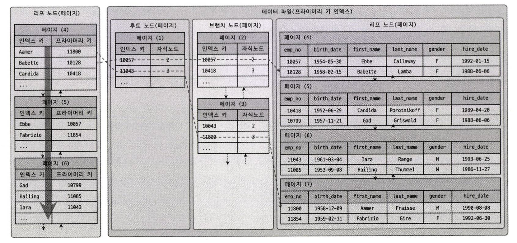 인덱스에 저장돼 있는 프라이머리 키 값을 이용해 프라이머리 키 인덱스를 한번 더 검색한 후, 프라이머리 키 인덱스의 리프 페이지에 저장돼 있는 레코드를 읽는다. 즉, 모든 세컨더리 인덱스 검색에서 프라이머리 키를 저장하고 있는 B-Tree를 한번 더 검색해야만 데이터 레코드를 읽을 수 있다.