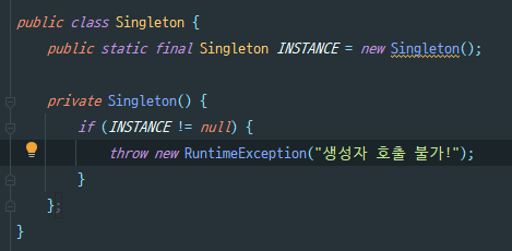 단, 리플렉션 API를 사용하면 private 생성자를 호출할 수 있어 새로운 인스턴스를 생성할 수 있다. 이를 해결하기 위해서는 생성자에서 두 번째 객체가 생성될 때 예외를 던지면 된다.
