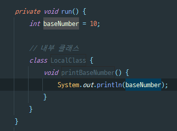 내부 클래스에서 참조하는 변수가 달라진 것을 확인할 수 있다. 즉, 외부에 존재하는 baseNumber가 내부에 baseNumber에 의해 가려진 것이다.