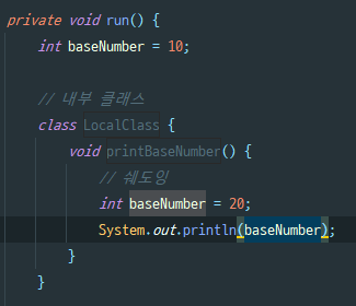 내부 클래스에서 baseNumber를 참조하고 있다. 하지만 이때 내부에 같은 이름을 가진 변수를 선언해보자.