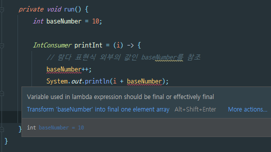 이 처럼 값을 복사해오기 때문에 참조되는 변수는 변경되면 안 된다. 즉, final이어야 한다. 참조되는 변수의 값을 변경하려고 하면 동시성 문제가 발생할 수 있어 컴파일 에러가 발생한다.